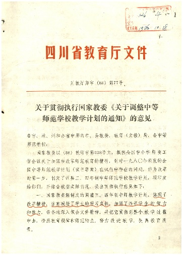 1984年以前,执行教育部1980年颁发的《中等师范学校教学计划(试行草案)》。省教育厅 1986 年制发了《四川省关于调整中等师范学校的教学计划》。图为1986年《四川省关于调整中等师范学校的教学计划》