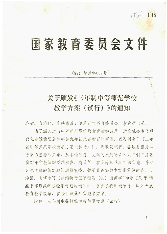 1989年,国家教委于发布了《三年制中等师范学校教学方案(试行)》方案要求:中师教育要适应社会主义现代化建设发展和实施九年制义务教育的需要。中师的课程内容要联系小学实际,注重教学实践,把学生培养成文理兼备、多才多艺、教学基本功过硬、全面发展的小学合格教师。图为《三年制中等师范学校教学方案(试行)》